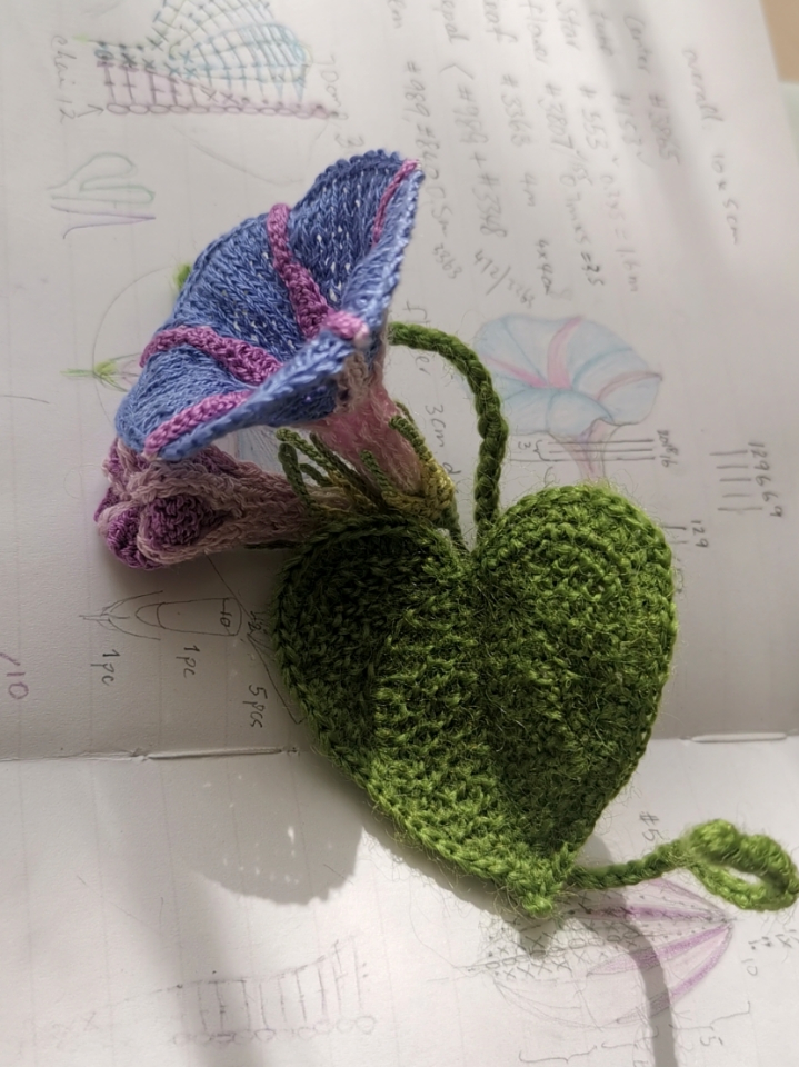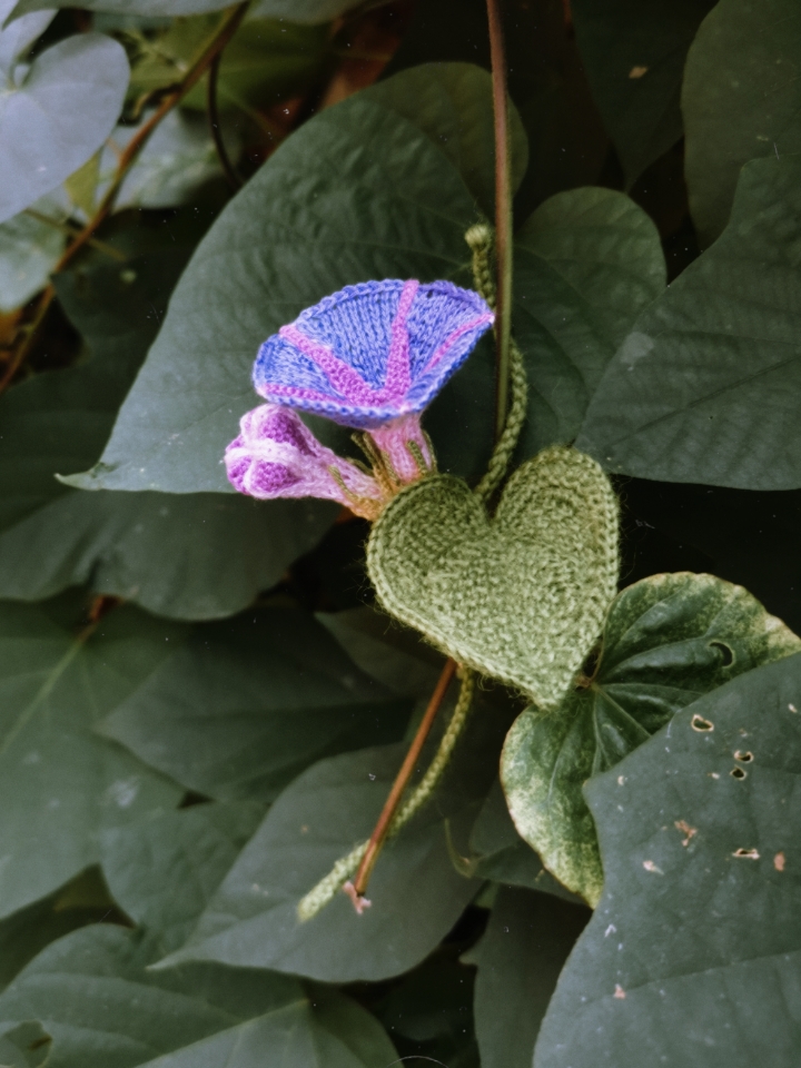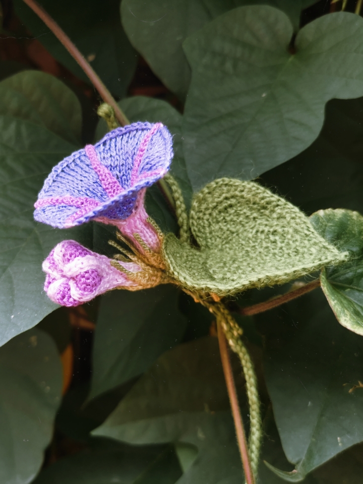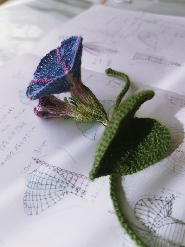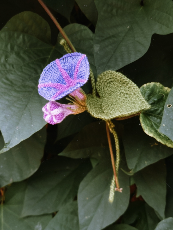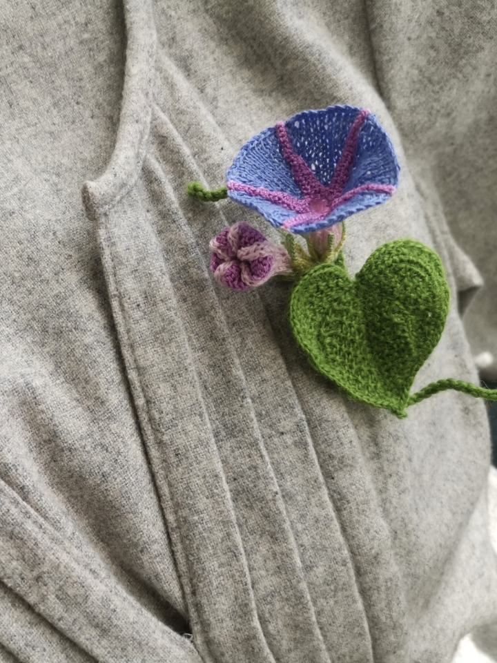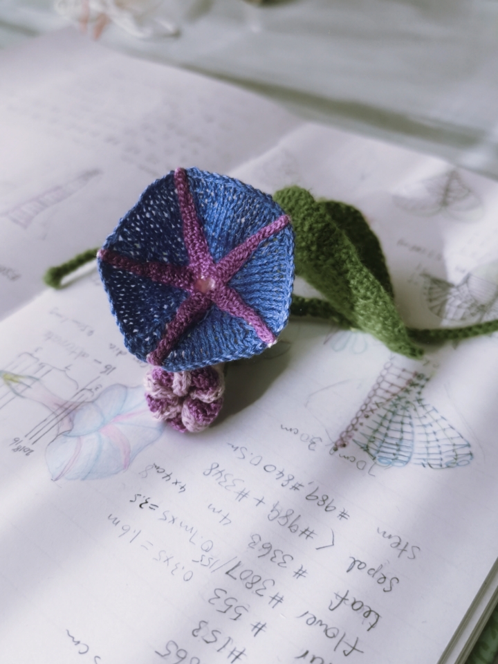 Morning Glory 2 is an extension to the previous Morning Glory pattern. Instead of joining two making methods on the flower, it is entirely knitted. It also has different shades to the front & back of the star. What’s more to this pattern, is a super textured fine leaf. The bouquet is made with a combination of knitting, crochet and braiding techniques. These methods produce different results, sometimes to a high degree. I’d like to encourage you through this pattern to experience alternative ways of making. Enjoy!