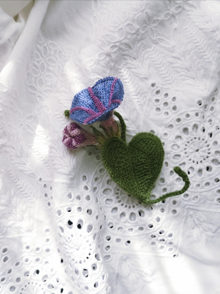 Morning Glory 2 is an extension to the previous Morning Glory pattern. Instead of joining two making methods on the flower, it is entirely knitted. It also has different shades to the front & back of the star. What’s more to this pattern, is a super textured fine leaf. The bouquet is made with a combination of knitting, crochet and braiding techniques. These methods produce different results, sometimes to a high degree. I’d like to encourage you through this pattern to experience alternative ways of making. Enjoy!