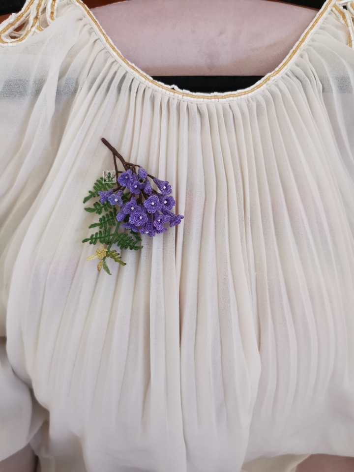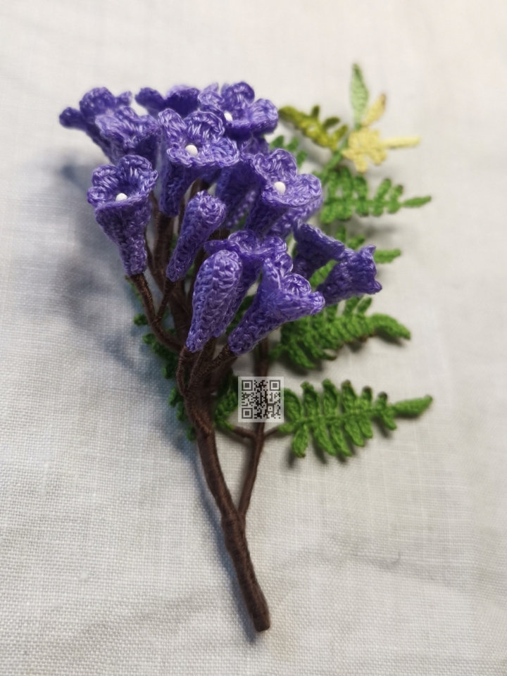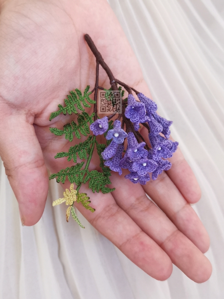 Breathtakingly beautiful tree for its heavy purple clusters and fern-like weeping leaves. This pattern takes simple steps to create these “squashed” trumpet shaped flowers. An elaborated compound bipinnate leaf pattern is also included.